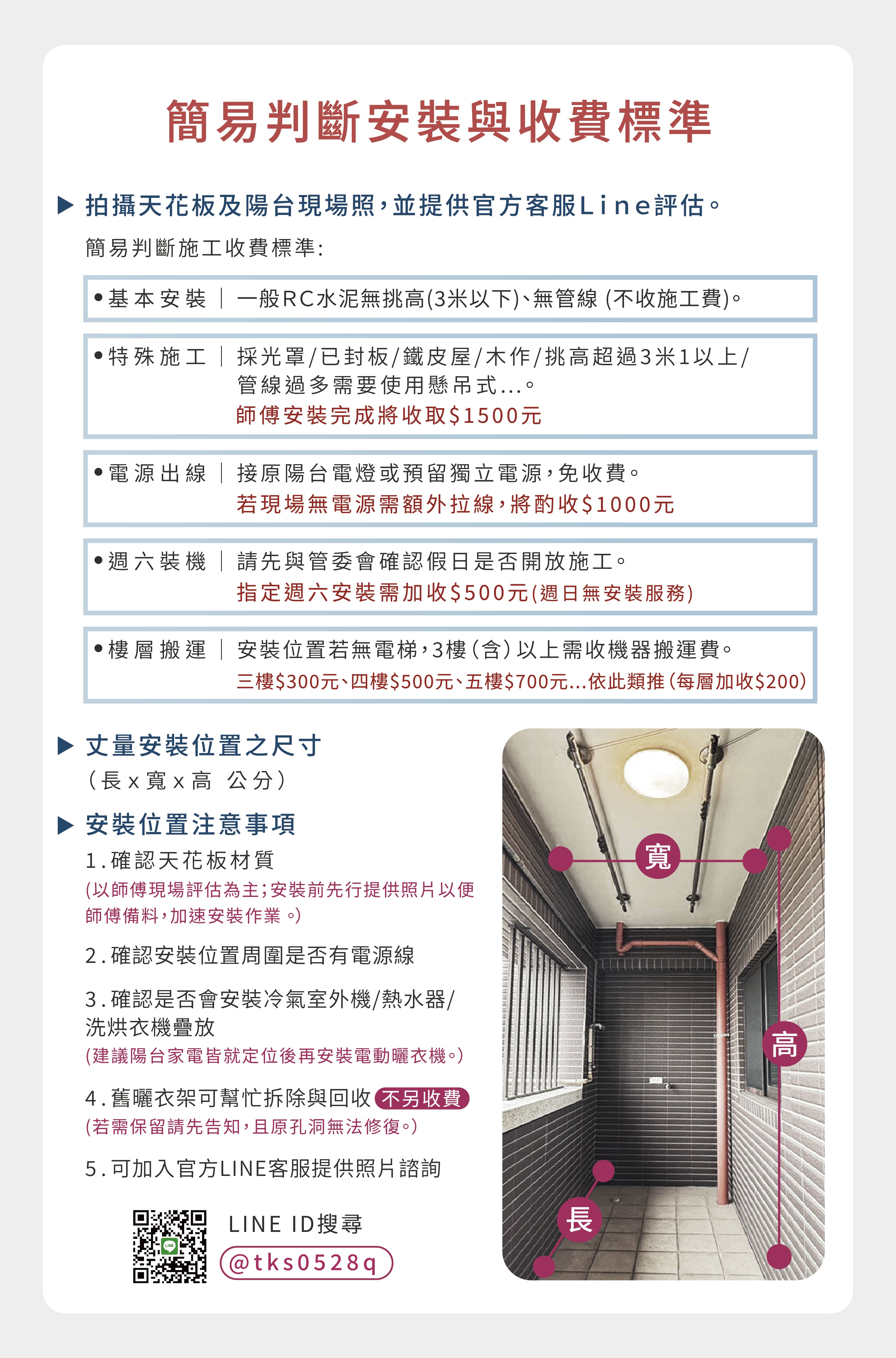 產品型號:MIT-170-CF 材 質:鋁合金 產品顏色:白色 主機尺寸:95cm /31cm /8cm(±5%) 承載重量:35kg以內 桿 長:117cm可延伸至170cm(±5%) 昇降高度:120cm(±5%) 產 地:台灣 適用電壓:AC110V/60HZ 功 能: ●LED調光 ●電動升降●全鋁合金●過熱保護●遇阻停機 ●承重35KG●主機三年保固(馬達六年) (附贈液晶遙控器、曬衣夾及產品保固書)