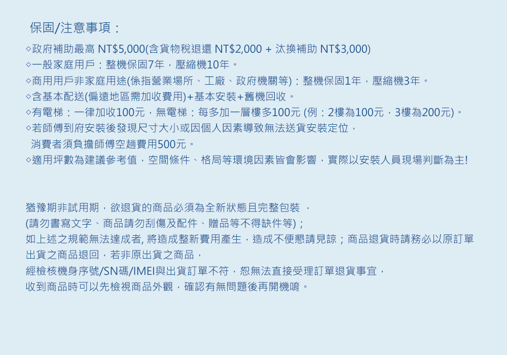 室內機型號:FAC-36V1CA1HYFH(I) 室外機型號:FAS-36V1CA1HYFH(O) 室內機尺寸 (寬*高*深):888x297x198 (mm) 室外機尺寸 (寬*高*深):814x564x344 (mm) 材質:塑膠 風速:自動、微風、低、中、高 能源等級:1 製冷能力:3.6kW 製熱能力:4kW 冷媒:R32 電壓:220V 頻率:60Hz 適用坪數:5-7坪